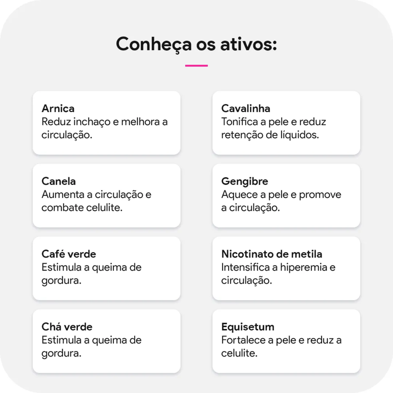 Sua fórmula inovadora em spray de rápida absorção reúne extratos naturais potentes que ativam a microcirculação, promovendo o aquecimento da pele e potencializando os resultados dos tratamentos estéticos e dos cuidados diários.