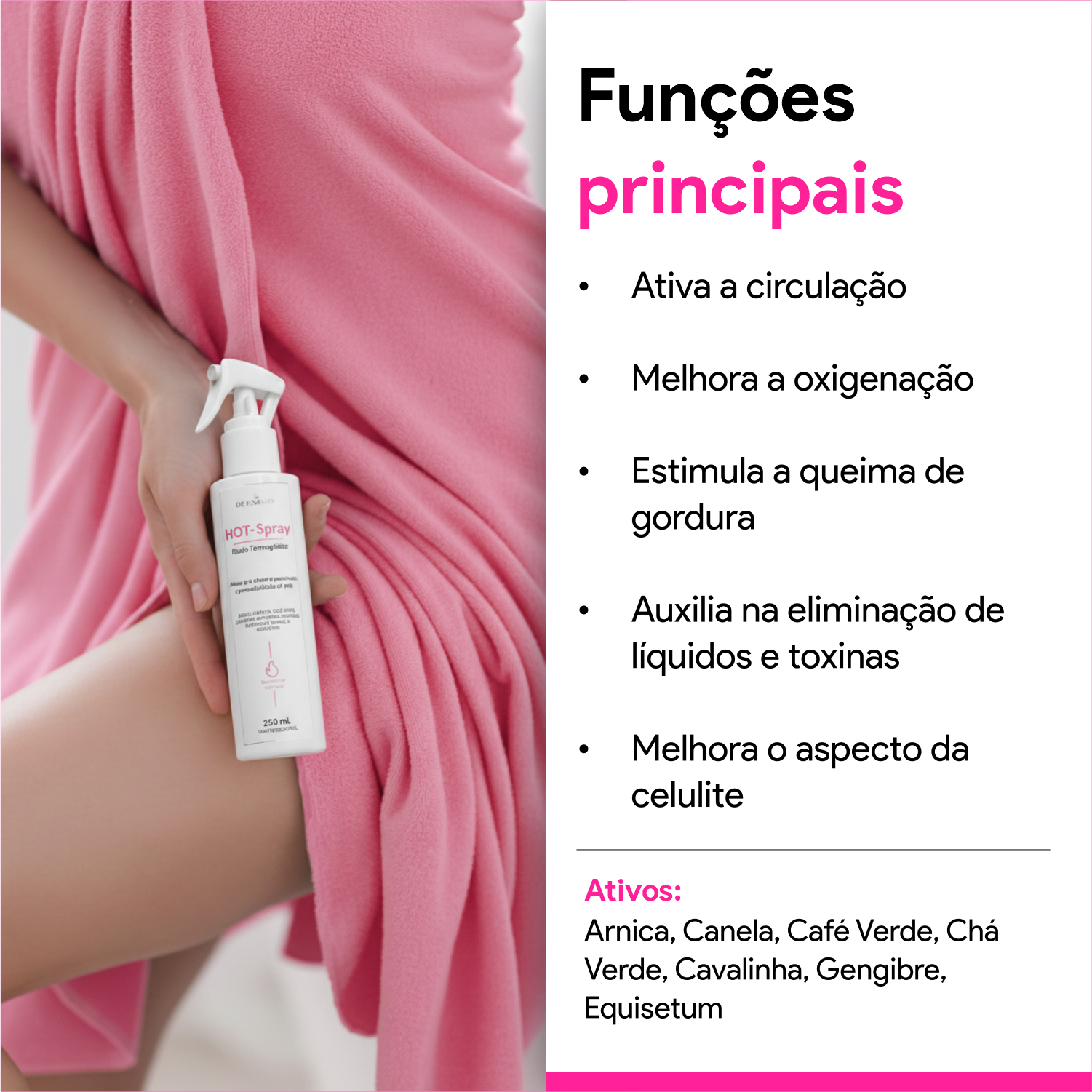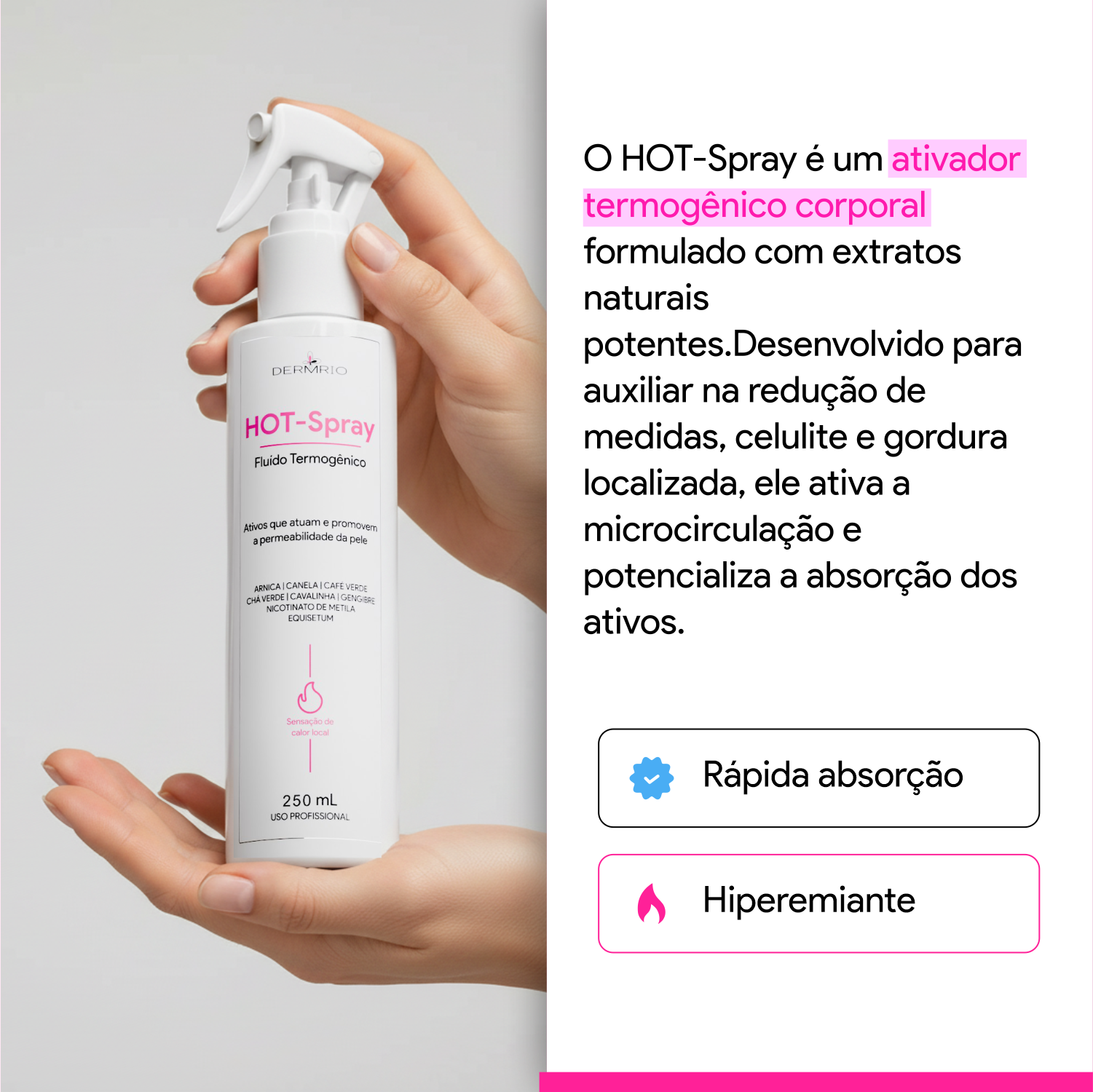 O HOT-Spray Dermrio é um ativador termogênico corporal em spray, formulado com extratos naturais como arnica, canela, gengibre e chá verde. Auxilia na redução de medidas, celulite e gordura localizada, ativando a microcirculação e potencializando resultados estéticos com praticidade e eficácia.