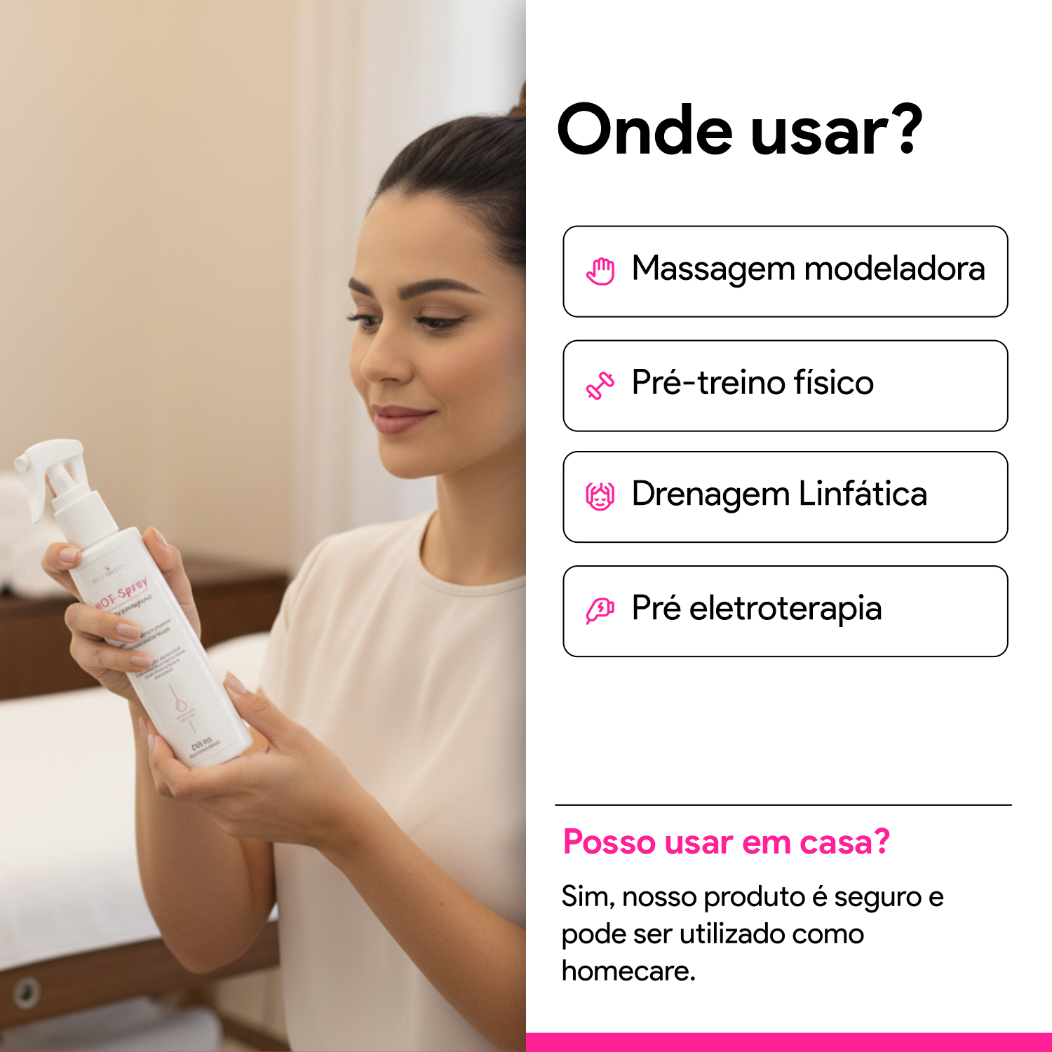 Ideal para uso profissional e doméstico, o HOT-Spray é perfeito para ser aplicado antes de massagens, treinos ou procedimentos estéticos, proporcionando um verdadeiro boost na sua rotina corporal.