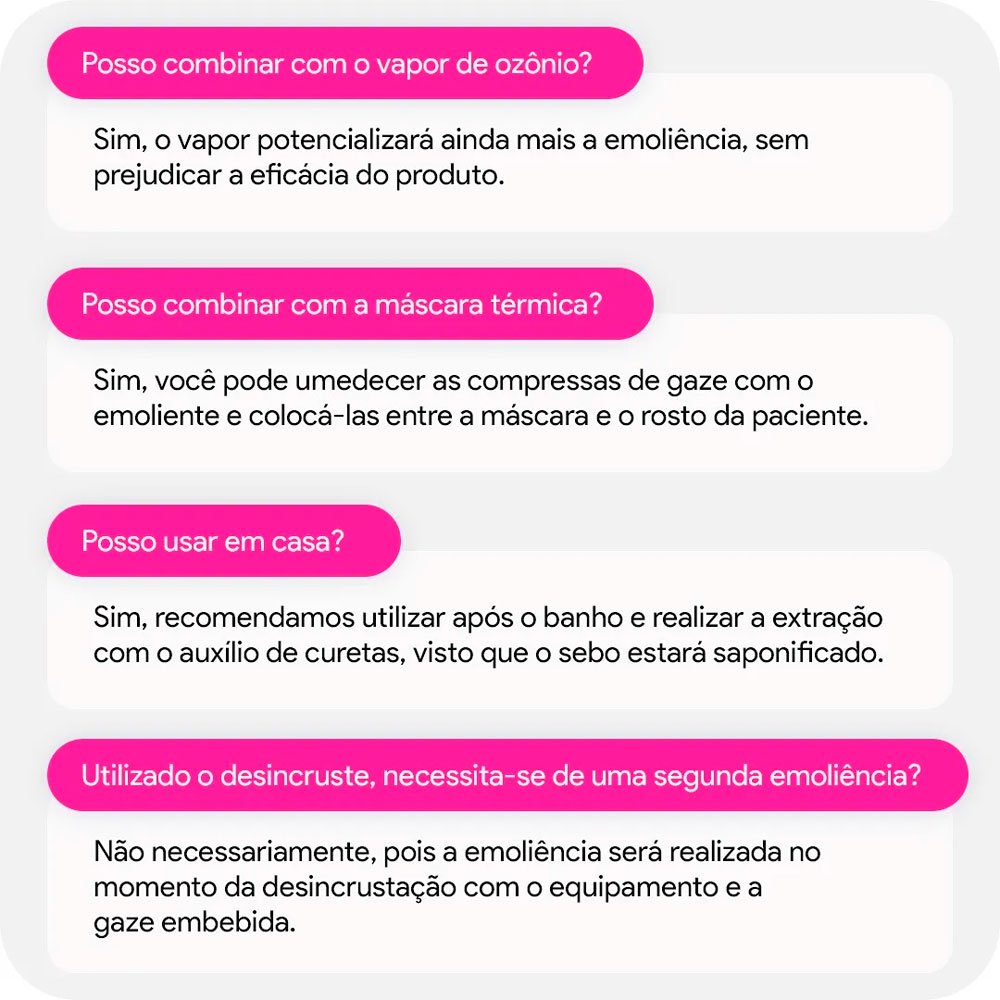 Indicação: Uso profissional, preparação da pele para procedimentos de emoliência e extrações