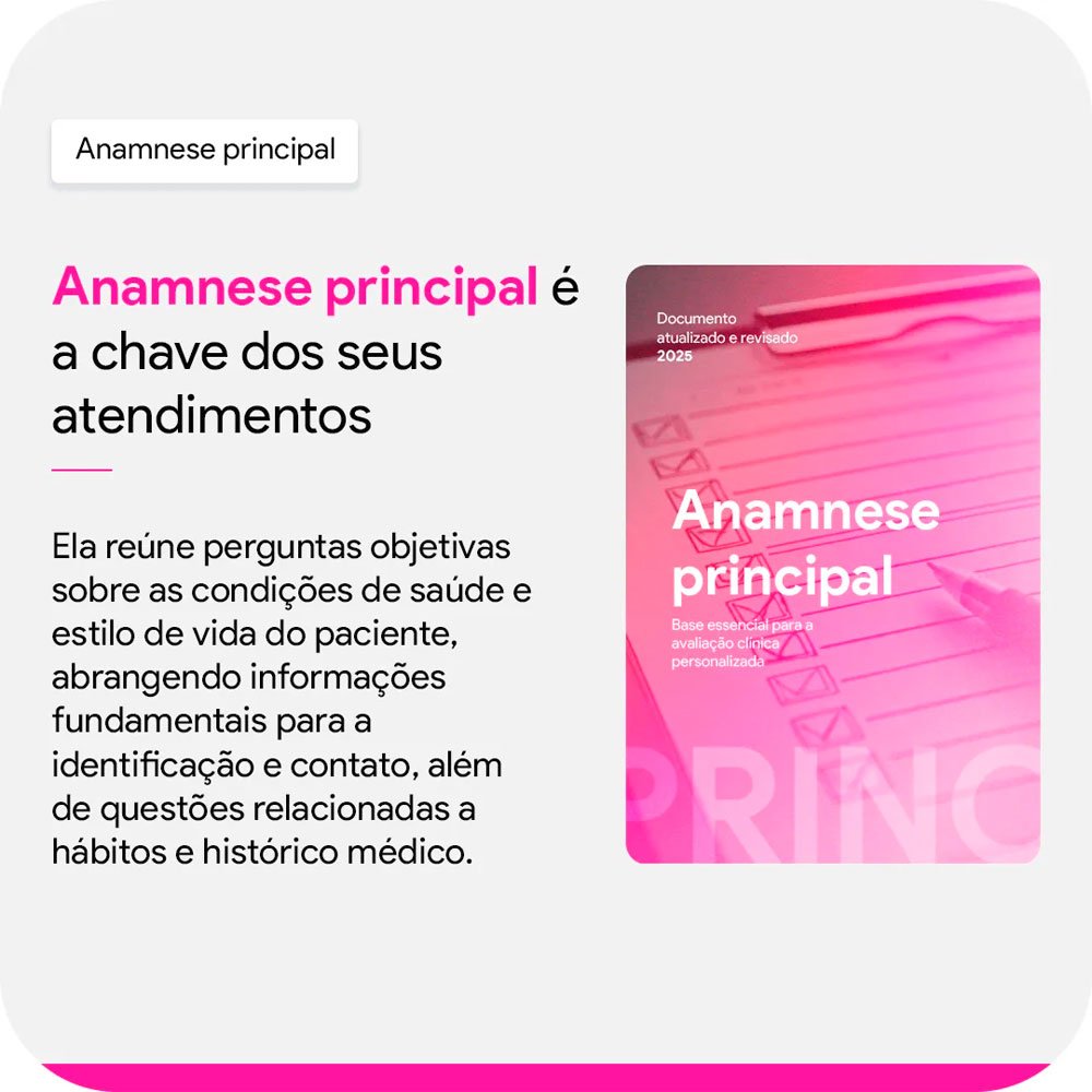 - Anamnese Principal: Avaliação ampla do histórico de saúde, hábitos e estilo de vida da cliente.