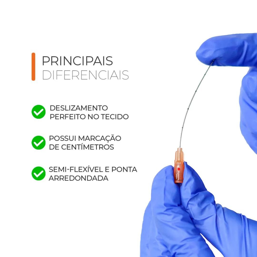 Desenvolvida para profissionais que buscam controle absoluto, possui marcações centimétricas em seu corpo para monitorar a profundidade da aplicação. É ideal para a entrega de preenchedores, bioestimuladores e ativos de mesoterapia, sendo compatível com seringas Luer Lock e Slip. Cada unidade acompanha uma agulha de pertuito para facilitar a perfuração inicial.