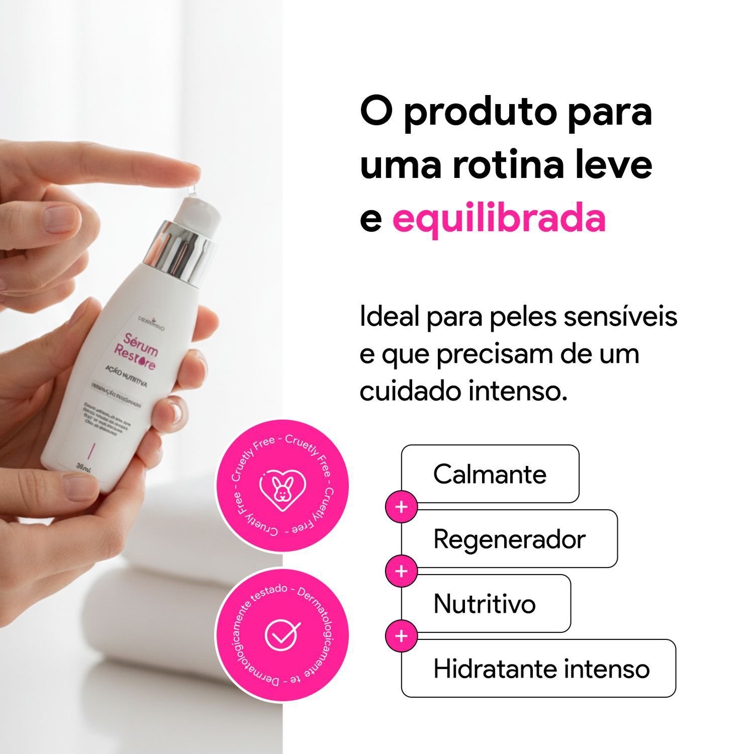 Seja no pós-procedimento ou na rotina de cuidados, o Sérum Restore é a escolha certa para uma pele protegida, saudável e com aparência renovada.