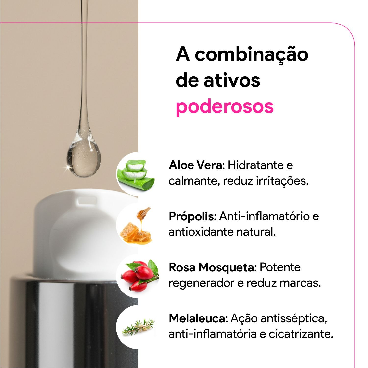 Ativos principais: Aloe Vera, Extrato de Própolis, Rosa Mosqueta e Melaleuca